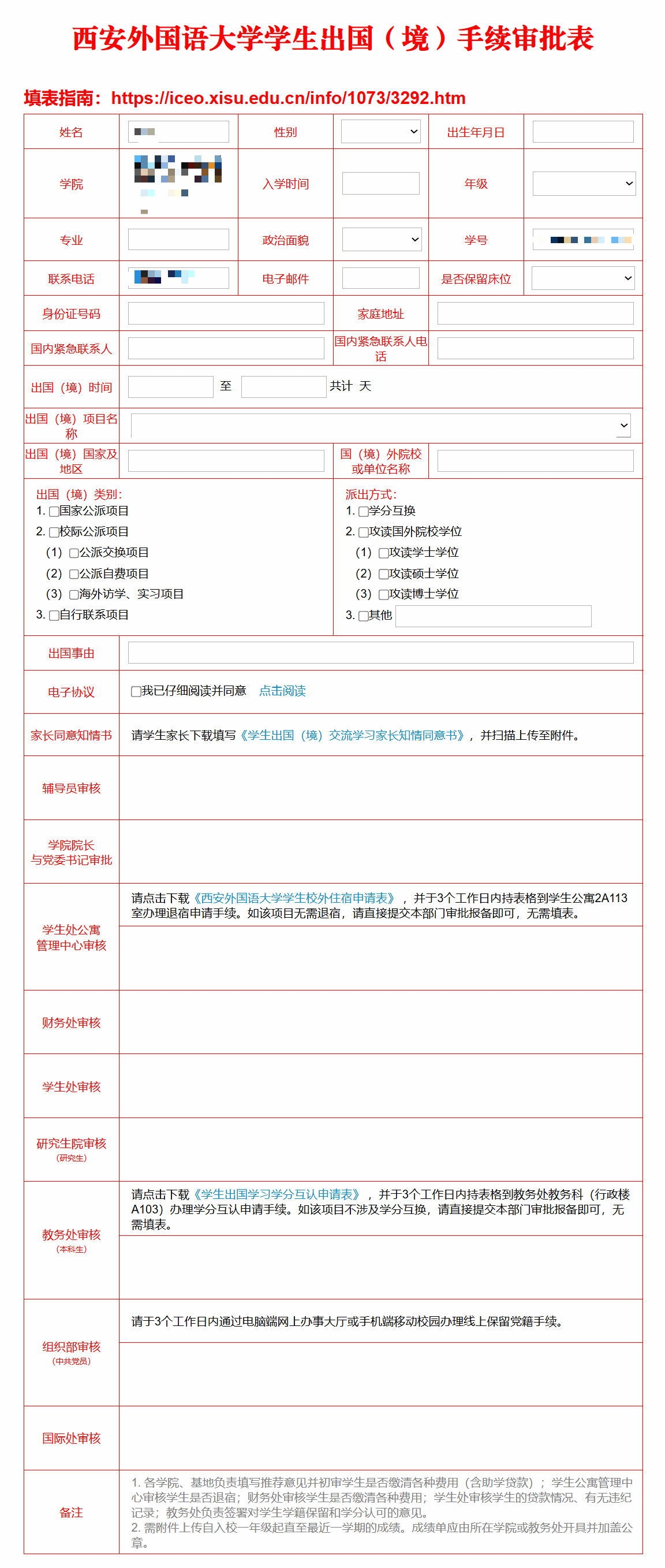 凡参与国际交流项目(含线上、线下)的在校学生(含毕业年级),须于项目启动前完成《西安外国语大学学生出国手续审批表》线上填报及全流程审批,并于学期末将办结后的审批表纸质版1份提交所在学院存档。线上审批具体流程如下: