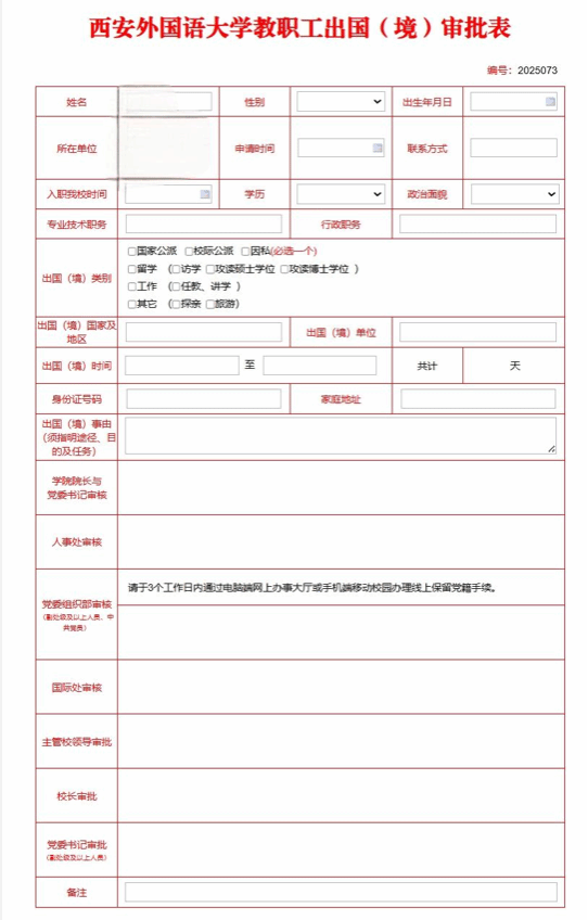 1 | 线上填表 | 登陆西安外国语大学OA系统( https://oa.xisu.edu.cn/page/index), 依次点击“外事服务”→“教职工出国管理”→“出国手续”→“新建”,新建《西安外国语大学教职工出国(境)审批表》表单,按要求线上填报个人信息,务必保证信息真实有效,请勿漏填或错填。 |