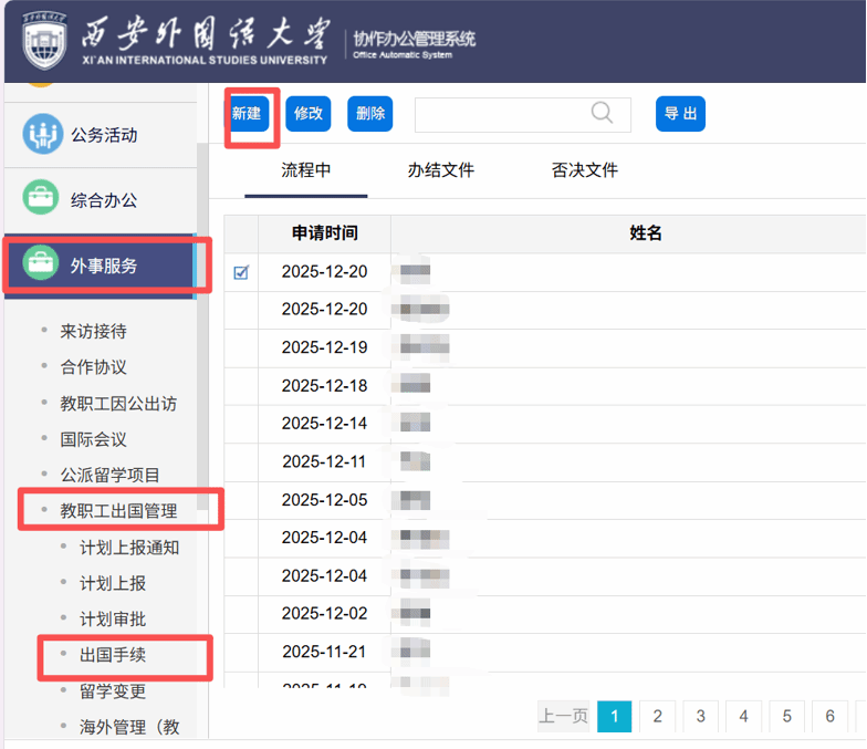 2. 点击“学生出国管理”-“海外管理”-“新建”,填表,依次提交至各部门审核。